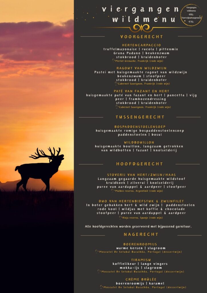 “Laat u verrassen door ons smaakvolle menu, met liefde bereid door onze keukenbrigade en vol aandacht voor lokale en regionale producten. Geniet van het verse brood van Bakker Piet uit Elspeet, het ambachtelijke ijs van Co uit Hoenderloo, en ons wild van de Veluwe, dat rechtstreeks van de Veluwse bossen op uw bord komt.