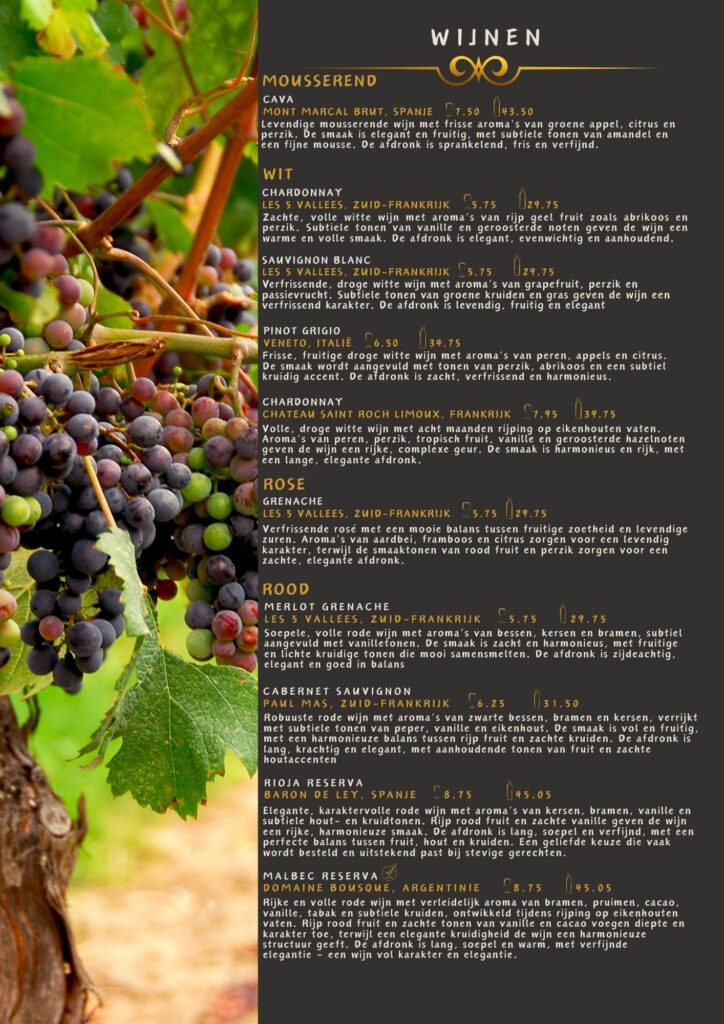 Onze zorgvuldig geselecteerde wijnen, uitgekozen door het DrankenKabinet uit Ermelo, maken uw culinaire ervaring compleet.
